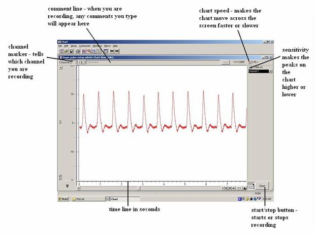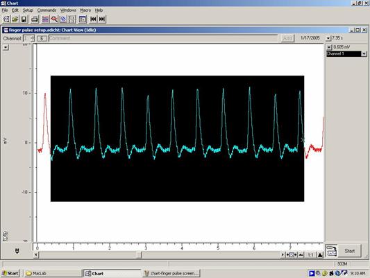 1. Check the channel marker. Make sure the channel label says channel 1', and that the pulse transducer is attached to the top plug of channel 1 on the MacLab box.
