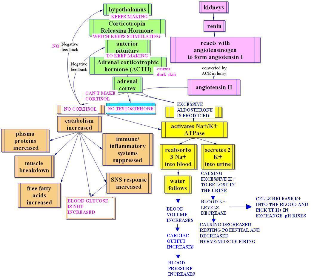 A child has a genetic defect in which he is unable to make any adrenal cortex hormones except aldosterone. Since cortisol usually shuts off the hypothalamic CRH secretion by negative feedback, his low cortisol levels will cause his hypothalamus to keep secreting CRH. The CRH will stimulate his anterior pituitary to release more ACTH. The excess ACTH will cause hyperpigmentation, or darkened skin. But because his adrenal cortex cannot make cortisol, cortisol levels will remain low. The low cortisol will make it harder for him to raise blood glucose, especially when stressed. Because his adrenal cortex is being stimulated, it will keep trying to make cortisol. The cortisol precursors may be made into excess aldosterone, which would turn on the Na+/K+ ATPase and cause K+ to be secreted into the urine, lowering blood K+ levels. This decreases resting potential and his nerves and muscle will fire less easily. To correct the low blood K+, the cells will start to release K+ into the blood, using their K+/H+ exchange. This will cause H+ to move into the cells, and there will be less H+ in the blood. The blood will be more alkaline, with a higher pH. As Na+ is reabsorbed from the urine into the blood, water follows. They increase blood volume. Blood pressure increases because of an increased cardiac output. |