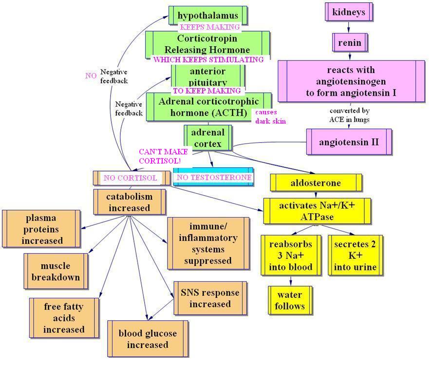 A child has a genetic defect in which he is unable to make any adrenal cortex hormones except aldosterone. Since cortisol usually shuts off the hypothalamic CRH secretion by negative feedback, his low cortisol levels will cause his hypothalamus to keep secreting CRH. The CRH will stimulate his anterior pituitary to release more ACTH. The excess ACTH will cause hyperpigmentation, or darkened skin. But because his adrenal cortex cannot make cortisol, even though the adrenal cortex is being stimulated by ACTH, cortisol levels will remain low. |