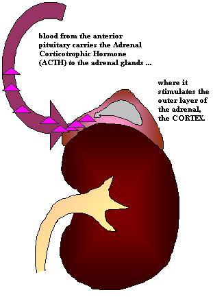 Adrenal Corticotrophic Hormone will stimulate the Adrenal Cortex, the part of the adrenal that makes steroid hormones. It makes Aldosterone, Cortisol, and Testosterone. The hypothalamus and pituitary are trying to keep one of these hormones at a stable value by turning the adrenal cortex on and off. But which one? |