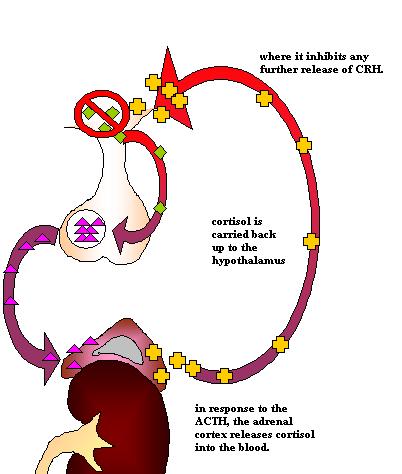 Adrenal Corticotrophic Hormone will stimulate the Adrenal Cortex, the part of the adrenal that makes steroid hormones. It makes Aldosterone, Cortisol, and Testosterone. The hypothalamus and pituitary are trying to keep one of these hormones at a stable value by turning the adrenal cortex on and off. But which one? Right! Cortisol is the hormone controlled by the CRH-ACTH pathway. |
