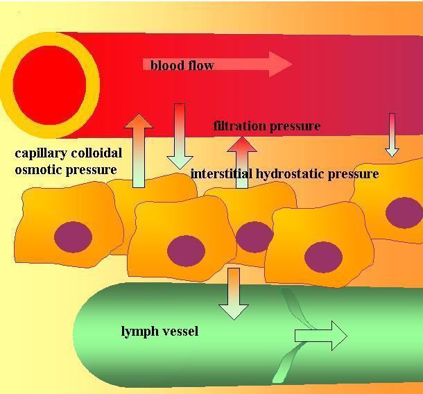 The filtration pressure is usually larger than the opposing forces, so a larger volume of fluid enters the tissues than is removed from them. The lymph vessels remove this excess fluid. Fluid diffuses into the lymph vessels, and then when the tissue moves the fluid is squeezed past valves, which will not allow it to return to the tissues. The lymphatic fluid flows up to the lymph nodes, where white blood cells remove pathogens from it, and then is emptied back into the venous blood returning to the heart. A constant flow of fresh fluid passes over the tissues - from the capillaries, over the cells, and to the lymph vessels.