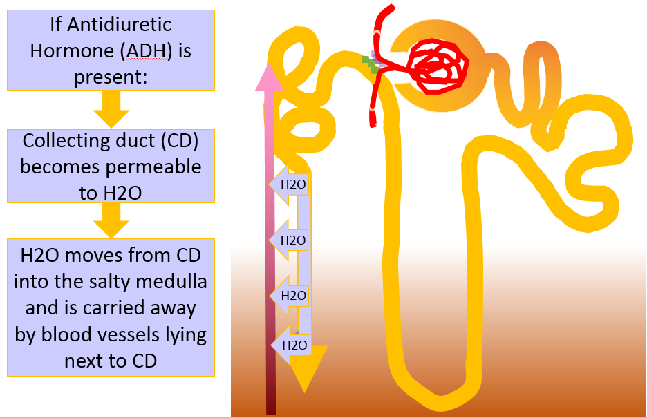 Anti-diuretic hormone (ADH)The name means 'against urination.' If you have a lot of ADH, you won't produce very much urine. So what is ADH doing to the collecting duct?