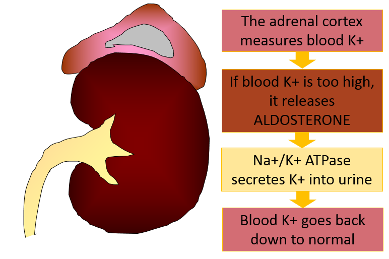 ![]() The first reason is very simple. The adrenal cortex, which makes the aldosterone, can measure blood K+. When the K+ concentration is too high, the adrenal cortex secretes more aldosterone, causing the distal tubule to secrete the excess K+ into the urine.