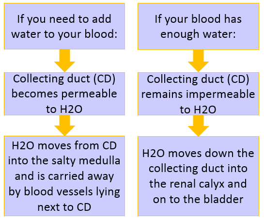 Page 16 You figured it out! Water from the urine in the collecting duct will be reabsorbed into the salty medulla by osmosis. It will enter blood vessels carrying blood out of the medulla, and be carried away - returning vital water to the blood! But this won't happen all the time. If you drank a lot of water, you wouldn't need to retain it - and in fact, you wouldn't. We've all experienced really dilute, watery urine after we drink a lot of water. So your collecting duct must be able to turn water reabsorbtion on or off. In fact, that's exactly what your collecting duct does. When you need to reabsorb water into your blood, the collecting duct lets water pass through its walls, from the urine back into the medulla and the bloodstream. When you have plenty of water and need to dump some of it out in your urine, the collecting duct's walls become waterproof, and all the water inside runs straight to the renal calyx and the bladder.