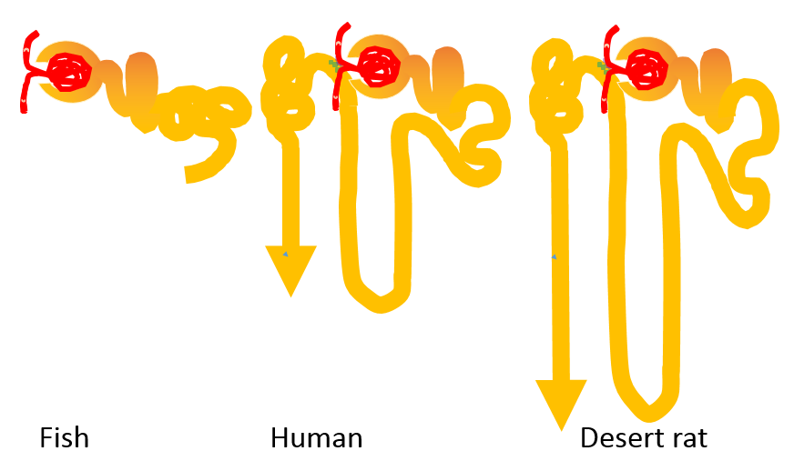 ![]() When you were an early fetus, this was all your nephrons had -- the glomerulus, Bowman's capsule, proximal convouted tubule and distal convoluted tubule. It's all fishes have, too. No Loop of Henle, no collecting duct. Why? Here's a comparative diagram that may give you a clue. What are the Loop of Henle and the collecting duct needed for?