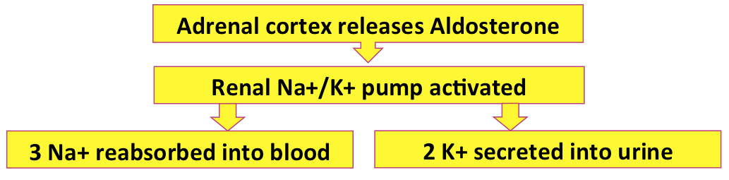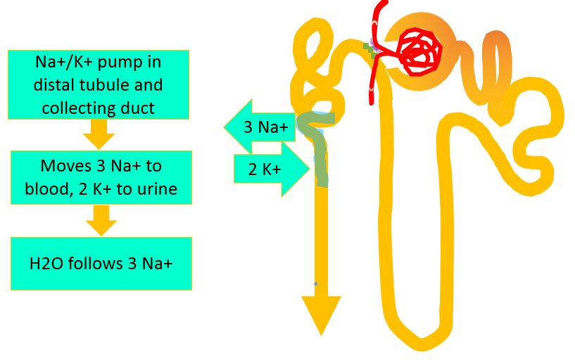 ![]() The distal convoluted tubules are important for balancing K+ levels in the blood, because they are able to secrete K+ into the urine with their Na+/K+ ATPase pumps. They are also important for maintaining blood pressure, because they move Na+ into the blood and water follows by osmosis. But what will tell them when to do this? If you know the renin-angiotensin-aldosterone pathway, you know what hormone turns on the Na+/K+ ATPase; ALDOSTERONE.
