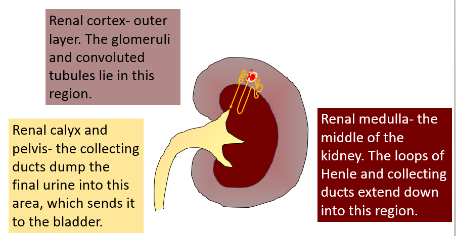 ![]() It's pretty obvious when you compare different animals - the Loop of Henle and Collecting Duct are for retaining water. But how can they do it, when you don't have any such thing as a water pump in your body? The only way your body can move water is to move solutes, and then the water will follow the solutes; but then you have added both solutes and water to your blood, so the blood osmolarity has not changed. That's not going to help a desert animal very much, because evaporation in the hot, dry desert will remove water from the animal's body. How can this animal retain just water, to keep its blood from getting dehydrated? Let's look at the very clever way the Loop of Henle, collecting duct, and blood vessels work together to accomplish this. Page 14 To begin with, we need to look back at the gross anatomy of the kidney. Here it is cut open to show the important layers, with one nephron shown in yellow so you can see how it is positioned. ![]() You can see that the loop of Henle and collecting duct run down into the medulla. This must be where they work their magic to return water from the urine to the blood! So let's look at how the medulla is different from the rest of the kidney.
