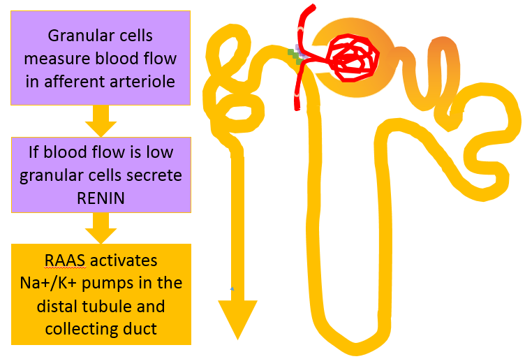 Page 10 The adrenal cortex is responsible for releasing aldosterone when blood K+ is too high. But we also want to release aldosterone when the blood volume has decreased. This is the job of the renin-angiotensin-aldosterone pathway. A specialized group of cells is found at the place where the glomerulus and the junction between the loop of Henle and the distal convoluted tubule are close together. This group of cells is called the juxtaglomerular apparatus (that just means 'close to the glomerulus'). ![]() One group of cells, shown in purple, is called the granular cells. These cells are attached to the afferent arteriole, and can detect how much blood is coming into the glomerulus. When blood flow decreases, they are responsible for releasing renin and starting the pathway which will eventually turn on the Na+/K+ ATPase pumps in the distal tubule and reabsorb Na+ and water to the blood. That will raise blood volume, and bring the flow in the afferent arterioles back to normal.
