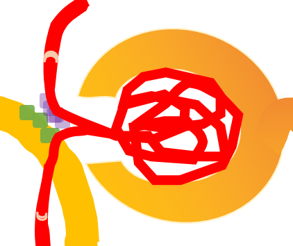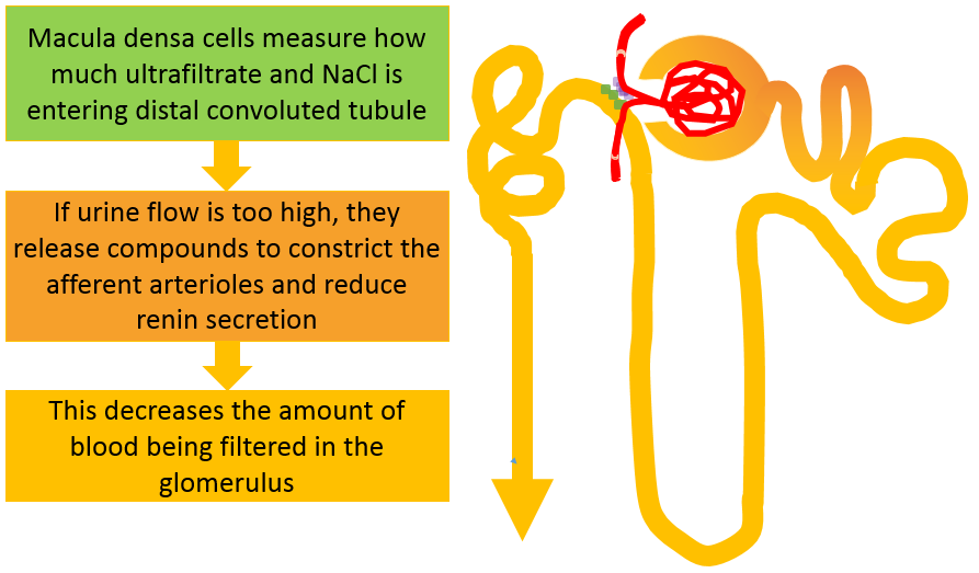 ![]() The cells shown in green are the macula densa, a set of cells that are part of the tubule. They can measure how much urine is passing through, how much NaCl is in that urine, and some other compounds in the urine. When there is too much blood being filtered, a lot of ultrafiltrate and NaCl will reach the distal tubule. The macula densa cells will release compounds that constrict the afferent arteriole and reduce the amount of filtrate being produced; also, the macula densa will decrease renin secretion, so Na+ and water are not reabsorbed into the blood. The combination of (1) constricting the afferent arteriole and (2) decreasing the blood volume by letting Na+ and water be lost in the urine will bring filtration back within normal levels.