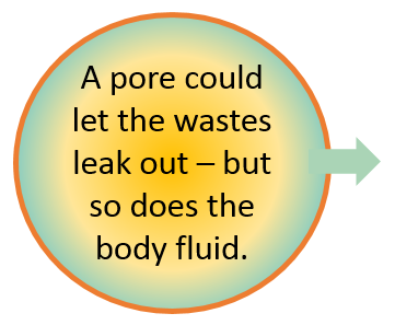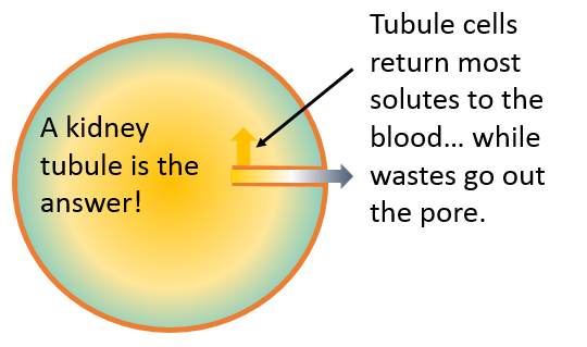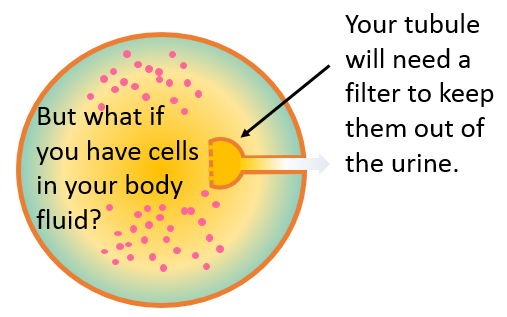 ![]() In this cross-section of a simple animal, nitrogenous wastes are being released into the body fluid. They will quickly poison the creature if they can't be removed! The simplest solution would be to just have a pore in the side of the animal, letting the wastes leak out. I bet you can predict the problem with this, though! ![]() How can our animal keep the good stuff while letting the bad stuff leak out? The answer is to pass the fluid through a tubule made of cells. The cells can sort out the stuff in the tubule, deciding what to save and what to excrete. ![]() This is the basic kidney! It's just a tube of cells that sorts what you need to keep from what you need to get rid of. The tube is called a nephron. Of course, large animals like you and me need more elaborate kidneys. Page 2 To start out with, you and I have cells in our body fluid - red blood cells, white blood cells, things we don't want to lose in our urine. We also have a lot of important proteins in our blood. So we need a filter on the inside end of our nephron, to keep those things from leaking into the urine.![]() Even more troublesome, though: we don't just let our body fluid slosh around inside us. We put most of it in blood vessels. So that nephron filter has to butt right up against a bunch of blood vessels. ![]() This is the basics of your kidney! Here are the three major processes that form urine: