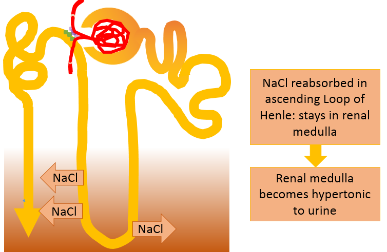 ![]() The medulla has one characteristic that makes it stand out - it is always really salty. It is hypertonic to the urine in the loop of Henle and the collecting duct. How did the medulla get that salty? Turns out that the Loop of Henle did it! The loop has ion pumps that move salt out into the medulla.