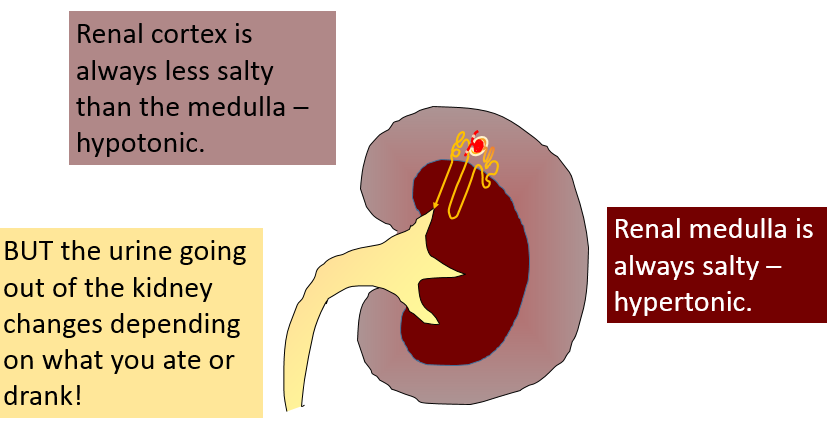 ![]() Now that you know about the salty medulla, I bet you can predict what will happen as the urine flows down the collecting duct, through this hypertonic area. What do you expect? water will move from the urine into the hypertonic medulla