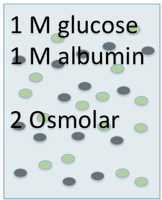 Introduction This tutorial will take you through the basics of Osmosis and some examples of how it applies in physiology. You will navigate through this tutorial using the buttons at the top of the screen. The tutorial will ask you questions. Click on your chosen answer to see feedback; click the answer again to make the feedback disappear. When you're finished with one page, click the navigation button for the next page to move ahead. Have fun! Click on button '1' to see the first page of the tutorial. Page 1 You learned in chemistry that MOLARITY means the number of moles of a particular compound in a liter of solution. So a solution might be "1 Molar glucose", and it would contain 1 mole of glucose in 1 liter of the solution. OSMOLARITY is the number of moles of ALL SOLUTE PARTICLES in a solution. For instance, if you took a 1 molar solution of glucose and added 1 mole of albumin, the solution would still be 1 molar glucose, because there is only 1 mole of glucose in the liter of solution ... and it would be 1 molar albumin, because there is only 1 mole of albumin in the liter of solution... but it would contain 2 moles of total solutes, so it would be a 2 OSMOLAR solution. ![]() ![]() Page 2 Osmolarity is a very useful concept in physiology, because there are so many different compounds dissolved in the blood that measuring all of them separately is impossible.It is possible to measure the blood osmolarity, though, and that gives an idea of how many total solutes are in the blood. What we are most interested in, though, is how many solutes are in the blood as compared to the cells, or in one compartment of the body as compared to another. The reason we care about that is that osmolarity controls the flow of water through cell membranes.