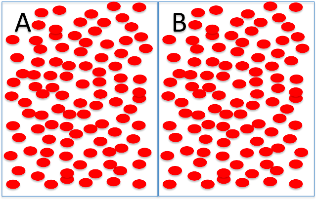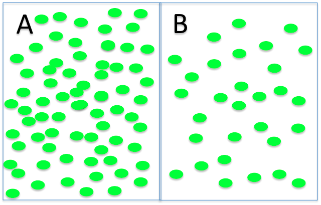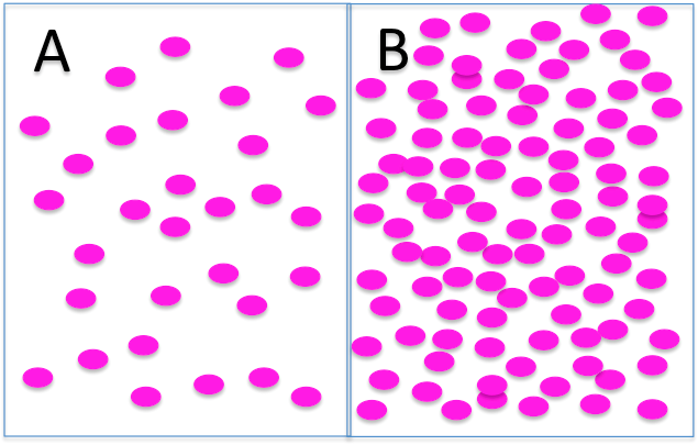Let's apply some of the terms to this situation. Which of the two solutions has the higher osmolarity? Which of these solutions do you think would be called the HYPEROSMOLAR one? Which of these solutions is HYPOSMOLAR? These terms are comparisons, so you might say one solution is hyposmolar to the other. Page 5 We've established that a solution with a lot of solutes in it is hyperosmolar and has fewer water molecules than a hyposmolar solution. Since osmolarity depends on the solute concentrations, we're going to stop even drawing the water molecules. In the diagrams below, each dot represents a solute molecule.