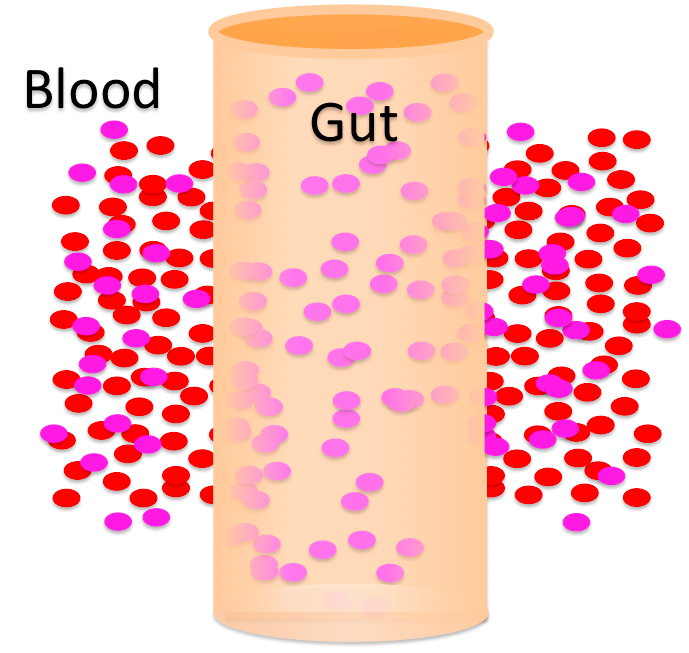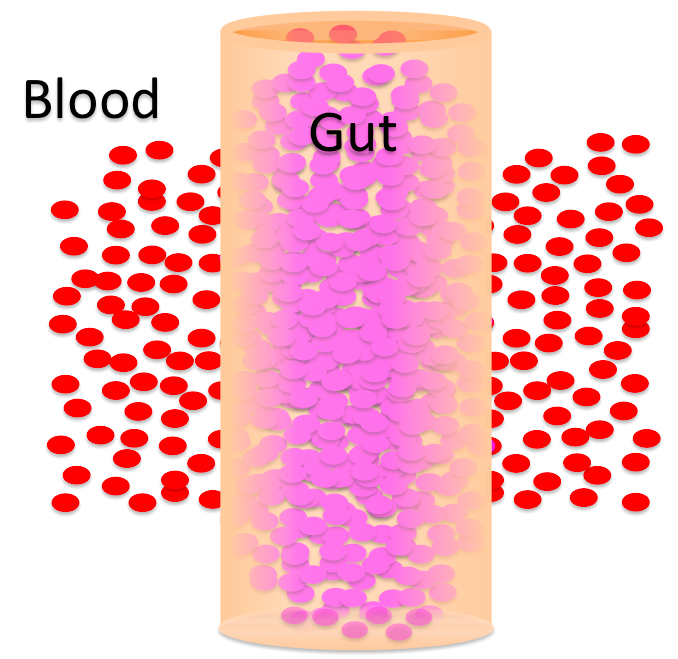 The contents of her intestines are hypertonic / hypotonic to her blood. That means the blood is hypertonic / hypotonic to the intestinal contents. Water will move from the blood into the intestinal contents / from the intestinal contents into the blood . Page 16 This looks like a problem, doesn't it? If you lost water from your blood into your intestines every time you ate, it could mean big trouble for you. Let's follow this food a little further, though. Further down in her intestines, the woman's cells begin to absorb the food. They move those solutes from her intestines into her blood.