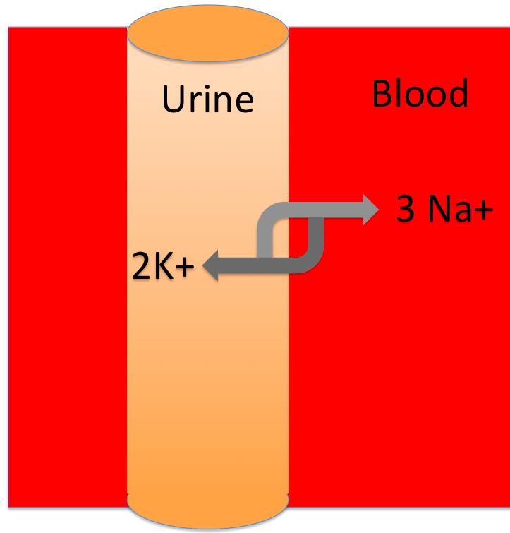 As solutes move from her intestines into her blood, the contents of her intestines become hypertonic / hypotonic to her blood. That means the blood is becoming hypertonic / hypotonic to the intestinal contents. Water will move from the blood into the intestinal contents / from the intestinal contents into the blood . This example shows you something new about osmosis. Not only does WATER FOLLOW SOLUTES into the blood or the cells or the intestinal contents: WATER FOLLOWS SOLUTES when they move from one area to another. So if you want to move water from one part of your body into another, the way to do it is to move solutes. Then the water will follow them. Water doesn't care which solutes it follows; it always follows the majority of solutes. Let's look at some situations in which your body uses this trick to make water go where it needs to. Page 17 Here's a tubule in your kidneys. The tubule is full of urine, and it has an ion pump called the Na+/K+ ATPase, that moves ions (solutes) between your blood and your urine. Your kidneys turn this pump on or off, depending on whether you need to keep water in your body or get rid of it in your urine. Let's figure out how it works!