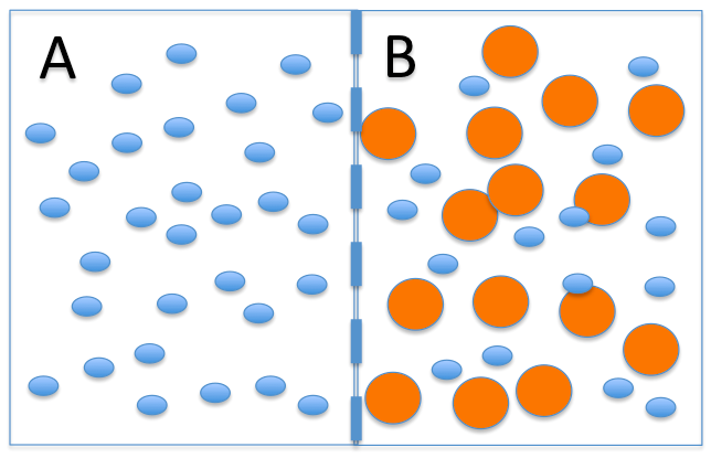 Page 3 Water can pass through most cell membranes. This means that when a molecule of water hits the membrane, it can go through. The number of water molecules that goes through depends on the number that hit the membrane.Look at the membrane below. Which side of the membrane will be hit by more of the blue water molecules, as they move about at random?
